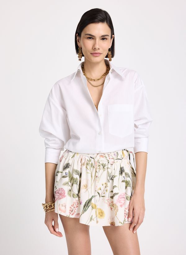 Confeccionada em algodão, a Camisa possui tecido plano levemente translúcido, gola clássica estruturada, decote frontal com vista e botões aparentes, mangas longas com punhos largos e botões delicados, bolso aplicado no busto, comprimento alongado com barra arredondada, fechamento frontal por botões e acabamento refinado.