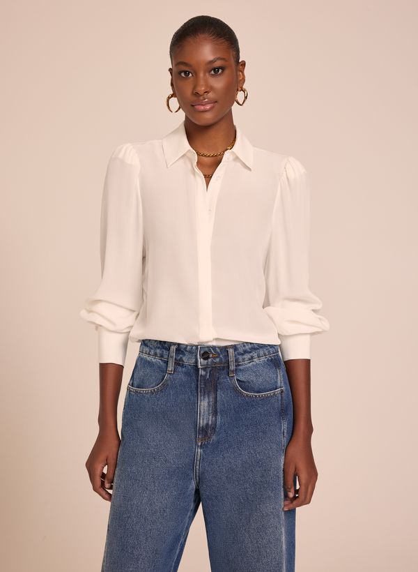 A Camisa é confeccionada em seda, possui gola com colarinho, mangas longas com abotoamento nos punhos, fechamento frontal por botões e vista sobreposta e acabamento pespontado.
