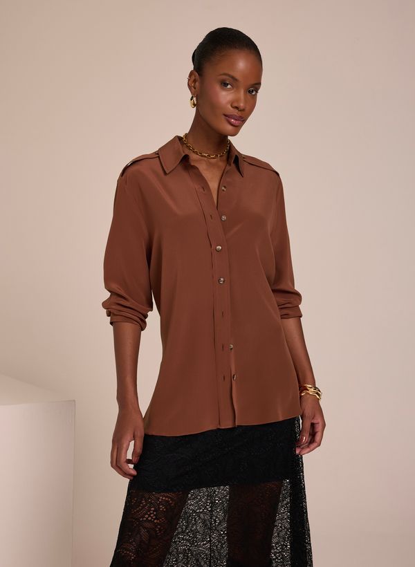 A Blusa é confeccionada em seda, possui caimento reto, colarinho, fechamento frontal por botões, martingales nos ombros, mangas longas, abotoamento nos punhos, prega posterior e acabamento pespontado.