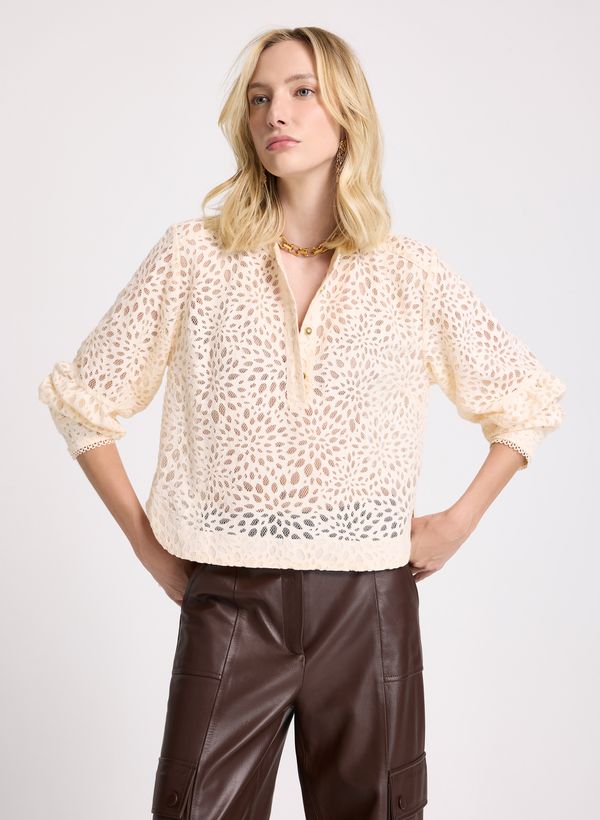 Confeccionada em tecido plano, a Camisa possui modelagem reta, comprimento regular, gola arredondada sem colarinho, vista frontal com recorte central, mangas longas com leve volume, punhos ajustados com acabamento delicado, padronagem vazada com transparência sutil, fechamento frontal por botões aparentes e acabamento refinado nas extremidades.