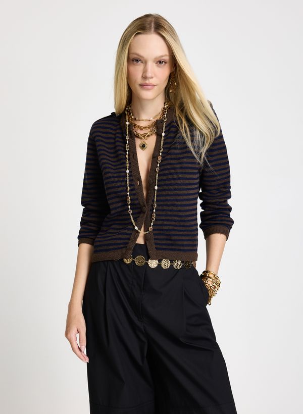 Confeccionado em tricot, o Casaco possui modelagem reta, comprimento curto, decote arredondado, mangas longas, padronagem listrada por toda a peça, detalhe de abas aplicadas nos ombros, acabamento canelado contrastante na gola, vista frontal e barra, fechamento frontal por botões forrados e acabamento pespontado.