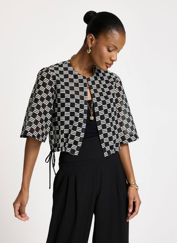 Confeccionado em tecido plano, o Casaqueto possui padronagem geométrica preto e branca, modelagem bomber, gola redonda, mangas 2/4 com transparência, barra com ajuste por cordão e acabamento pespontado.