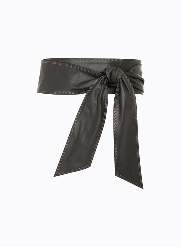 Produzido em couro, o Cinto possui modelagem ampla tipo faixa, acabamento liso, costura pespontada em todo o contorno e fechamento frontal por amarração com laço, conferindo ajuste regulável e caimento estruturado.