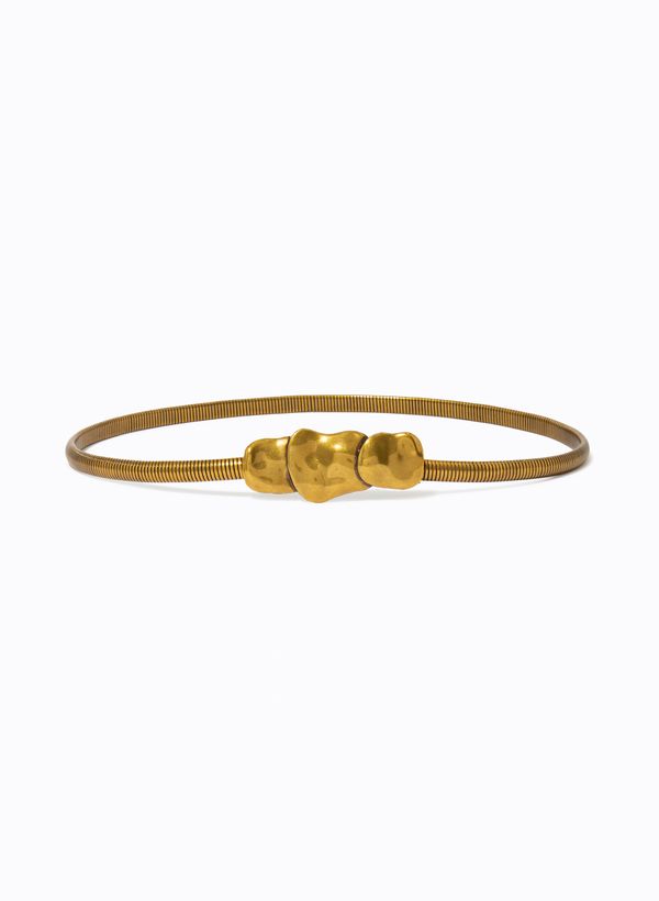 Produzido em metal, o Cinto possui estrutura rígida em formato tubular, aplicação central de peças orgânicas com acabamento polido em tom dourado, espessura fina e modelagem ajustada ao corpo, fechamento posterior por encaixe metálico.