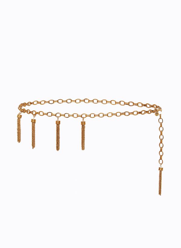O Cinto é confeccionado em metal, possui banho dourado, espessura fina, corrente com pingentes modelo tassels e fechamento por gancho.