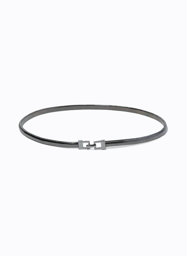 Produzido em metal, o Cinto possui estrutura fina e flexível, superfície composta por segmentos metálicos contínuos que formam um visual uniforme e brilhante, fivela geométrica em metal com encaixe frontal e acabamento polido em toda a peça.