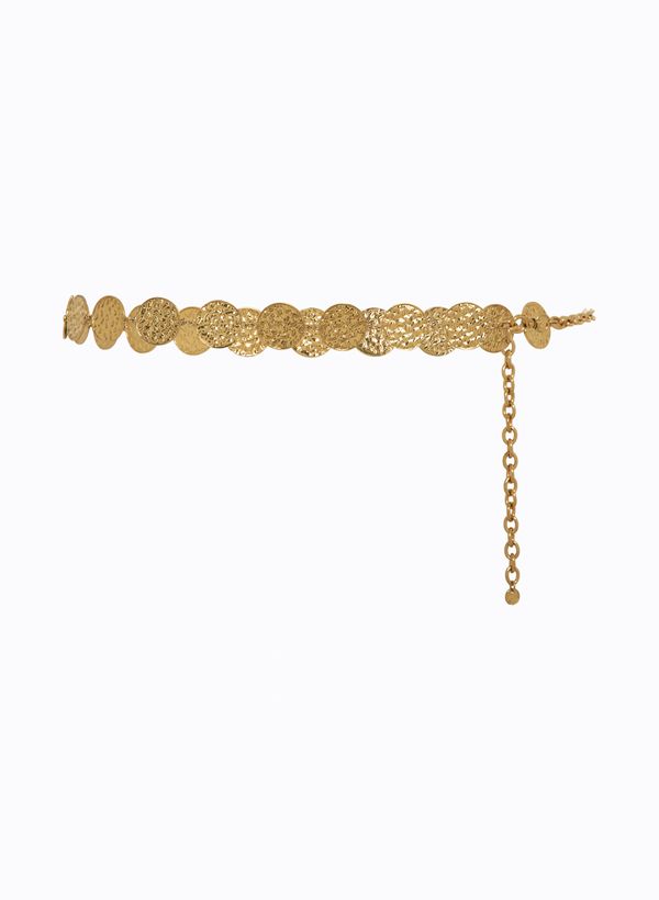 Produzido em metal, o Cinto possui estrutura composta por discos circulares com textura martelada interligados por elos delicados, design ajustável que permite diferentes formas de uso na cintura, comprimento de 110 cm, acabamento polido e fechamento por mosquetão com corrente extensora.
