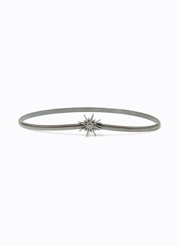 Produzido em metal, o Cinto possui modelagem fina com corpo texturizado em efeito de espiral metálica, fivela em formato de estrela de oito pontas com aplicação de cristais brilhantes, acabamento polido em tom prateado e fechamento frontal por encaixe.