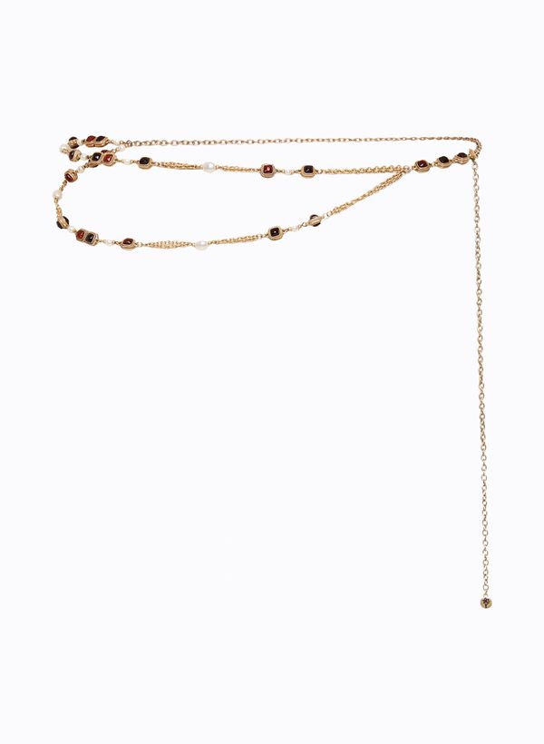 Confeccionado em metal, o Cinto possui design em camadas com correntes finas entrelaçadas, aplicação de pedrarias em tons quentes e detalhes em pérolas, fechamento por mosquetão com corrente extensora ajustável e acabamento polido que garante brilho e sofisticação.