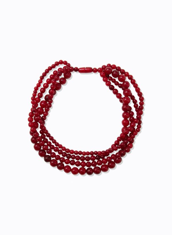 Produzido em resina, o Colar possui cinco voltas de contas arredondadas em diferentes tamanhos, estrutura volumosa que envolve o colo, acabamento polido que realça o tom intenso de vermelho e fechamento posterior magnético.