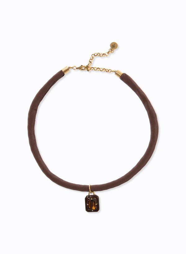 Produzido em seda, o Colar possui estrutura tubular revestida, pingente central geométrico em resina com aplicação de vidro lapidado, metais em latão e zamac, corrente extensora ajustável com mais 8 cm e fechamento por fecho tipo lagosta.