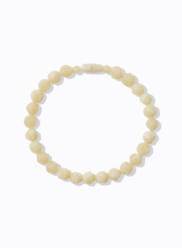 Produzido em resina, o Colar possui contas facetadas em tom off white distribuídas de forma uniforme, estrutura arredondada que envolve o colo, acabamento polido que garante brilho sutil e fechamento posterior magnético.