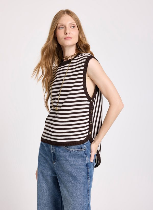 Confeccionado em tricot, o Colete possui padronagem listrada, decote arredondado, cavas amplas, acabamento canelado na gola e nas cavas, barra levemente arredondada e não possui fechamento.