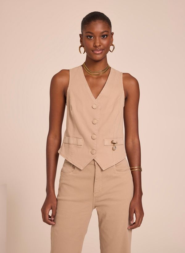 Confeccionado em sarja cotelê, um tecido resistente, similar à sarja, mas com texturas canelada, o Colete possui modelagem justa, decote em "V", alças médias, fechamento frontal por botões, bolsos frontais decorativos e acabamento pespontado.
