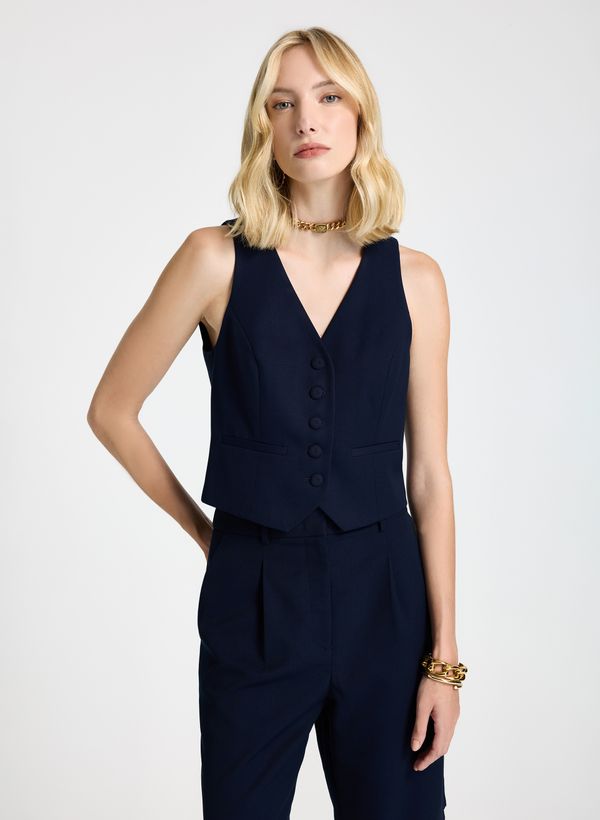 Confeccionado em tecido plano, o Colete possui modelagem ajustada ao corpo, decote em "V" profundo, recortes estratégicos que valorizam a silhueta, bolsos frontais embutidos decorativos, fechamento frontal por fileira de botões forrados e acabamento interno forrado com leve brilho.
