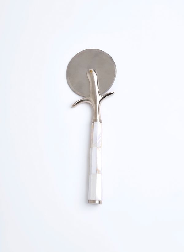 Produzido em aço inoxidável escovado com banho prateado fosco, o Cortador possui cabo geométrico inteiramente revestido em madrepérola natural, criando contraste elegante entre a opacidade do metal e os reflexos iridescentes do revestimento.