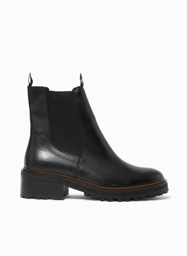 Produzido em couro, o Coturno possui modelagem de cano médio, bico arredondado, recortes laterais com elástico embutido, puxador posterior, salto baixo bloco, detalhe contrastante na entressola, solado tratorado e acabamento robusto.
