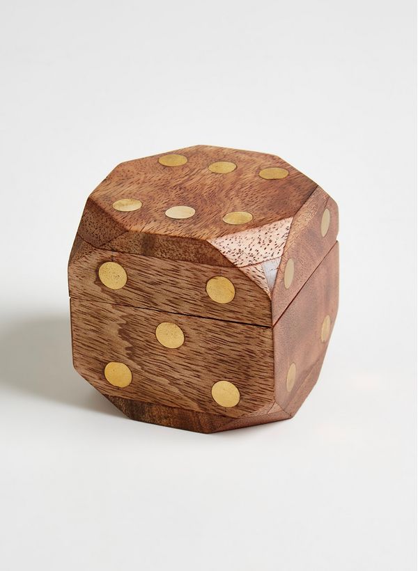 O Dado Prism é fabricado em caixa de madeira quadrada com tampa retrátil com trava para fechamento. Possui superfície externa com pontos em latão dourado, formando um dado e laterais com detalhe triangular. Contém cinco dados menores no interior da caixa, também feitos em madeira e latão. Produto possui acabamentos artesanais, portanto pode ocorrer pequenas variações de cores, tamanhos e formas.