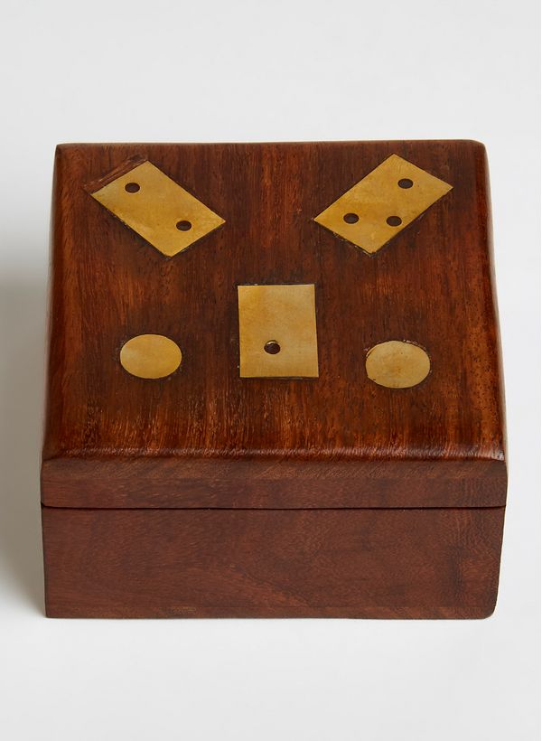 O Dominó Box II é produzido em caixa de madeira com acabamentos em latão dourado. Possui formato quadrado e fechamento por ímã. Produto possui acabamentos artesanais, portanto pode ocorrer pequenas variações de cores, tamanhos e formas.