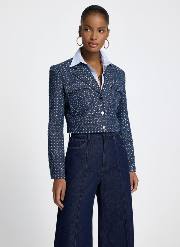 A Jaqueta é confeccionada em tecido plano, possui aplicação de paetês, gola com colarinho, mangas longas com abotoamento nos punhos, fechamento frontal por botões metálicos e acabamento pespontado.