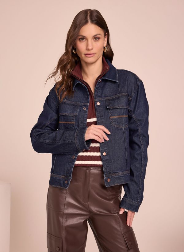 A Jaqueta é confeccionada em Jeans com lavagem escura, possui caimento reto, colarinho, fechamento frontal por botões, mangas longas com abotoamento nos punhos, dois bolsos, barra com martingales posteriores e acabamento pespontado contrastante.