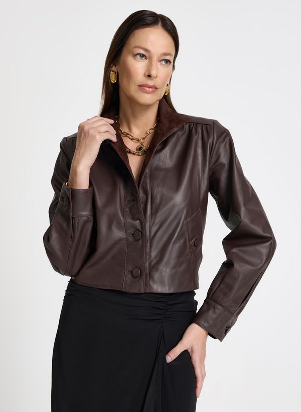 Confeccionada em couro, a Jaqueta possui modelagem reta, gola alta estruturada, mangas longas com leve volume e punhos ajustados, recortes verticais frontais e posteriores que valorizam o caimento, bolsos frontais embutidos com lapela, fechamento frontal por botões forrados e acabamento pespontado.
