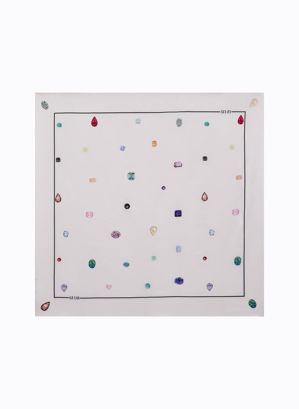 Produzido em material sintético, o Lenço possui formato quadrado, superfície lisa com toque leve, estampa localizada de elementos gráficos, contorno com moldura contrastante, assinatura da marca aplicada em uma das extremidades e acabamento refinado nas bordas com costura delicada.