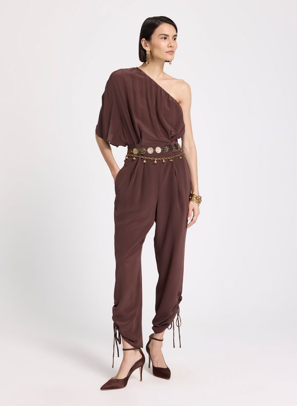 Confeccionado em seda, o Macacão possui modelagem longa, caimento fluido, decote assimétrico que valoriza o colo, manga única ampla com efeito drapeado, cintura levemente marcada, bolsos laterais funcionais, pernas alongadas com detalhe de amarração ajustável na barra e acabamento delicado.