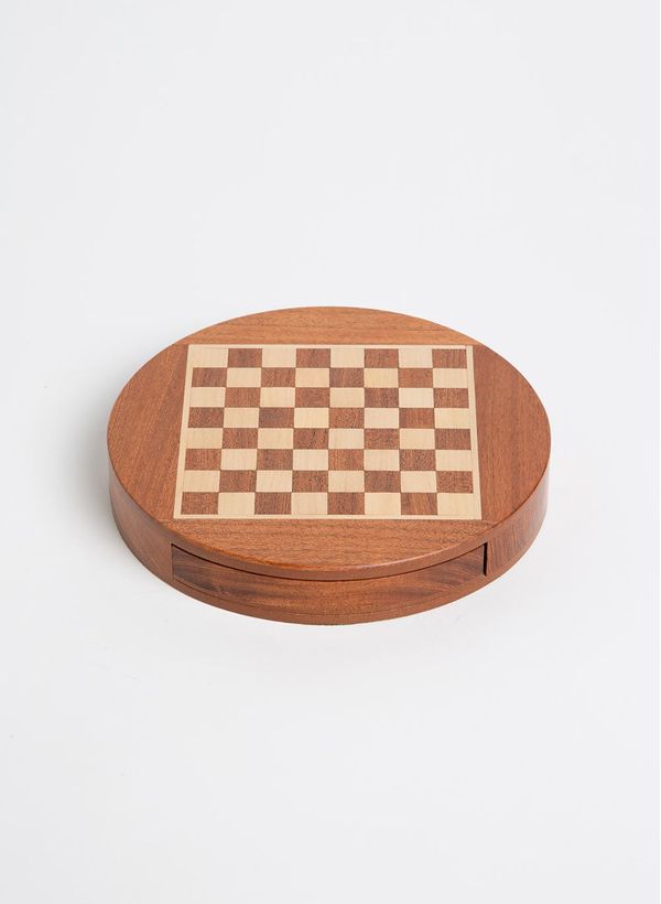 O Mini Xadrez é produzido em base de MDF com revestimento em madeira bicolor, formando o tabuleiro do jogo. Possui formato redondo cilíndrico e fechamento em encaixe de gaveta removível - que possui revestimento em material sintético verde (onde são acomodadas as peças do jogo), bem como o fundo da peça. O fundo das peças e o interior do tabuleiro são revestidos em imã, para facilitar a jogabilidade.