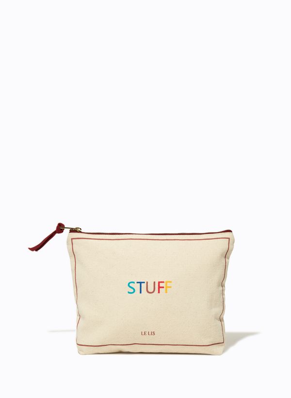 Produzida em algodão, a Necessaire possui formato retangular, estrutura macia, estampa frontal escrita “STUFF” em letras multicoloridas e borda contrastante em tom avermelhado, interior forrado em tecido listrado, fechamento superior por zíper metálico com puxador alongado em cordão e acabamento pespontado.