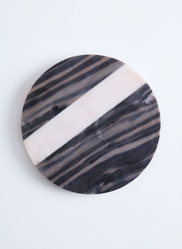 Produzido artesanalmente em mármore cinza com detalhe de faixa em mármore branco, o Prato de Servir possui formato redondo e apoios fixos na base. Pode ocorrer pequenas variações de tamanho e formato entre as peças por conter acabamentos manuais e variações de cores e padronagens do mármore por se tratar de material natural.