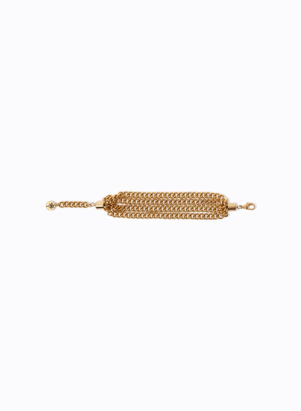 Produzida em metal, a Pulseira possui modelagem larga, estrutura composta por múltiplas correntes finas entrelaçadas lado a lado formando superfície uniforme, extremidades com placas metálicas retangulares, extensor com elos para ajuste, fechamento por fecho lagosta e acabamento polido.