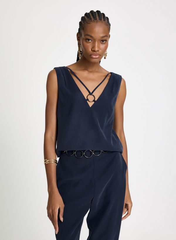 Confeccionada em tecido plano, a Regata possui modelagem reta, caimento leve, decote em V profundo na frente com tiras finas cruzadas e detalhe de argola central, alças largas, decote em V nas costas, acabamento limpo nas cavas e barra reta.