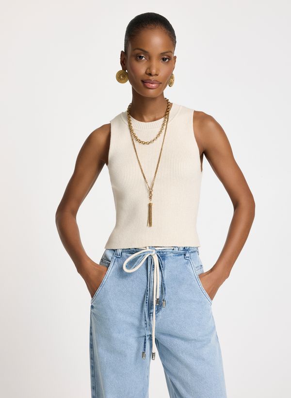 Confeccionada em tricot, a Regata possui caimento reto, gola redonda, alças largas, comprimento curto e acabamento canelado.