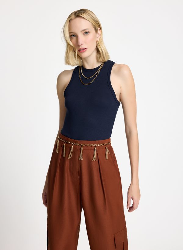 Confeccionada em malha, a Regata possui textura canelada, modelo nadador, gola ribana redonda, alças médias, detalhe torcido posterior e acabamento pespontado.