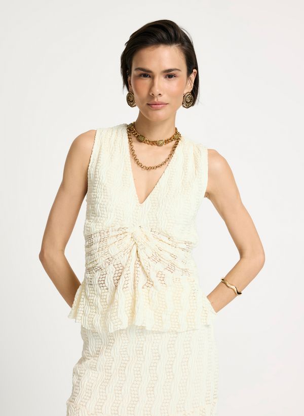 Confeccionada em tecido plano, a Regata possui modelagem ajustada, decote V profundo, detalhe drapeado centralizado abaixo do busto, leve efeito texturizado em toda a peça, barra com caimento sutilmente evasê e acabamento refinado.