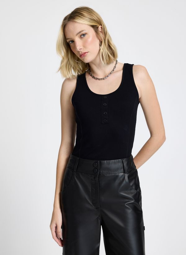 A Regata é confeccionada em malha, possui decote redondo, alças largas, detalhe frontal com botões decorativos e acabamento pespontado.