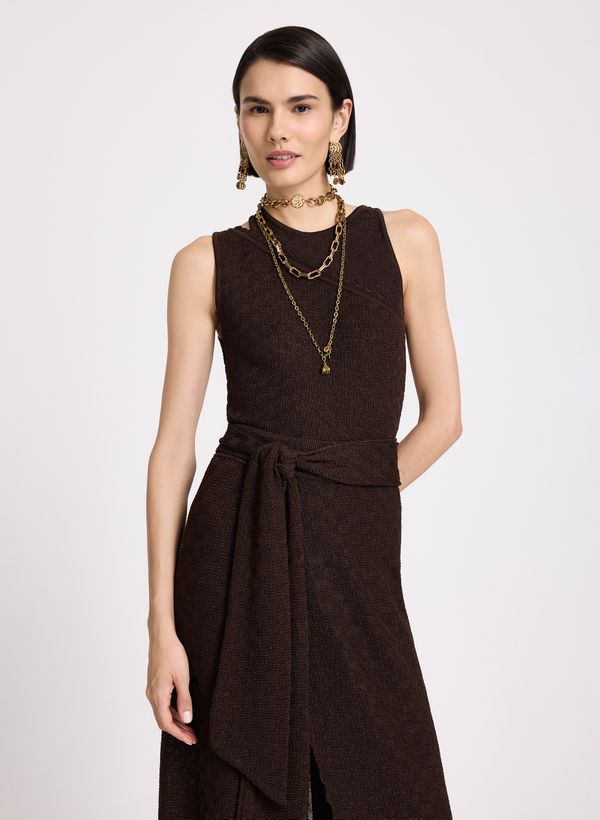 Confeccionada em tricot, a Regata possui modelagem reta, decote arredondado, cavas amplas, detalhe de recorte assimétrico no ombro esquerdo, textura trabalhada em padronagem uniforme por toda a superfície, barra com acabamento ondulado e contornos finalizados em tricot canelado.