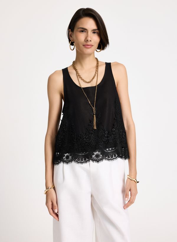 Produzida em tecido com aplicação de renda bordada floral, a Regata possui modelagem reta, decote arredondado profundo, alças largas, barra com acabamento em renda bordada e recorte arredondado.