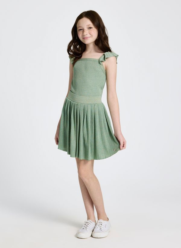 A Regata é confeccionada em tricot, possui decote reto, mangas curtas com babados e acabamento canelado.