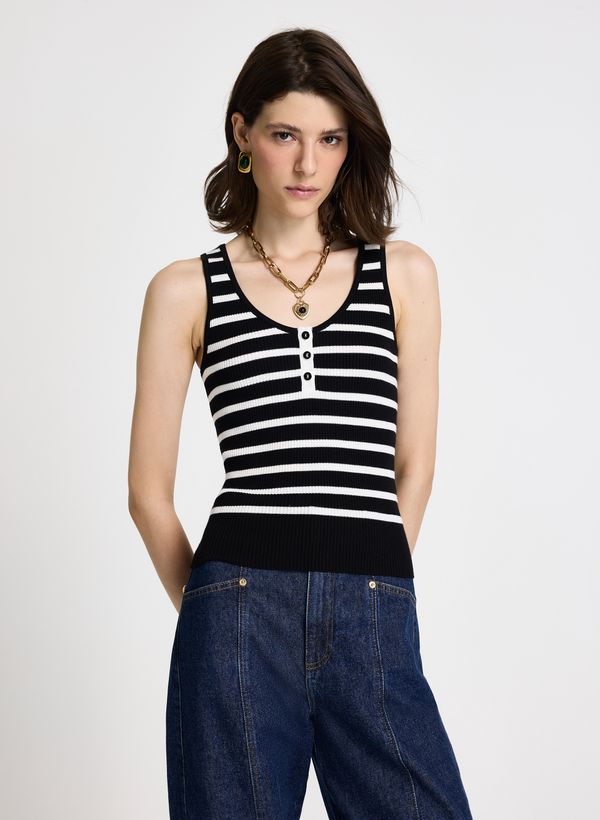 Confeccionada em tricot, a Regata possui modelagem ajustada ao corpo, decote arredondado na parte frontal e posterior, alças largas que garantem conforto ao vestir, padronagem de listras horizontais em contraste, detalhe frontal com vista aplicada e botões decorativos, acabamento em barra canelada sem fechamento funcional.