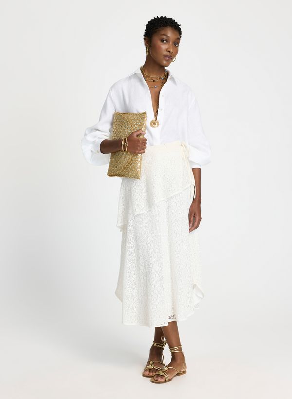 Confeccionada em algodão com poliamida, a Saia possui modelagem midi evasê, estrutura em tecido rendado com leve transparência, sobreposição assimétrica com recorte diagonal, cós liso e amarração lateral por tiras finas, além de forro interno que garante conforto e acabamento de barra levemente arredondado.