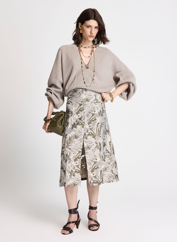 Confeccionada em tecido plano, a Saia possui modelagem evasê com comprimento midi, cintura alta que valoriza a silhueta, estampa de folhagens com desenho orgânico distribuída por toda a peça, recorte central vertical frontal com fenda que favorece o movimento ao caminhar, bolsos posteriores embutidos que agregam funcionalidade ao design e acabamento refinado nas barras.