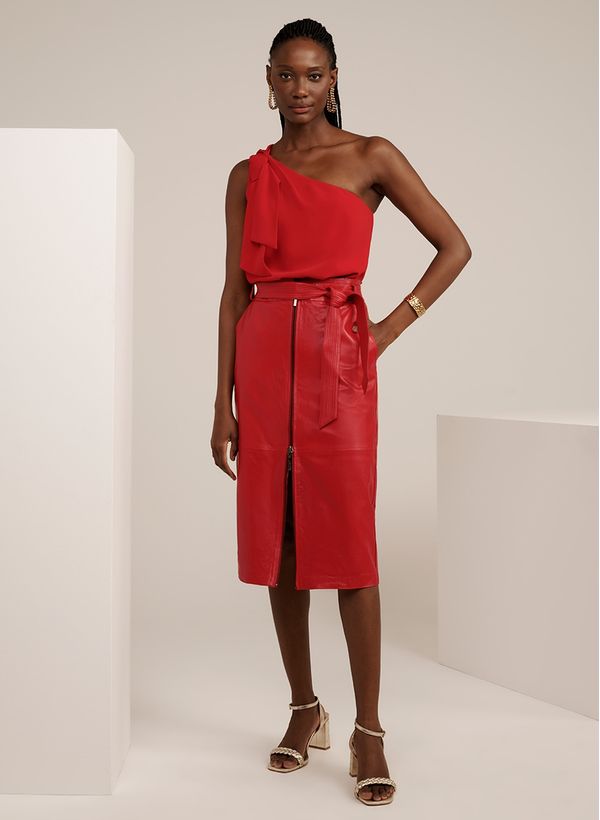 Confeccionada em couro, a Saia possui modelagem reta, cós com passantes e faixa pespontada, dois bolsos frontais, fechamento por zíper, comprimento médio e acabamento pespontado. A peça acompanha faixa do mesmo tecido.
