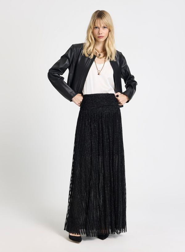 Confeccionada em malha, a Saia possui modelagem longa, cintura alta com cós largo estruturado, superfície com textura brilhante, transparência sutil com forro, fechamento por zíper invisível na parte posterior e acabamento delicado.
