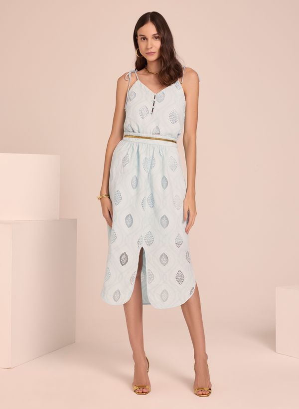 Confeccionado em poliéster, a Saia possui cintura alta com cós estruturado e elástico embutido, modelagem midi com caimento reto, recortes verticais que acompanham o comprimento da peça, trabalho em renda com padronagem geométrica vazada ao longo de toda a superfície, transparência com forro interno e barra reta com acabamento delicado em renda.