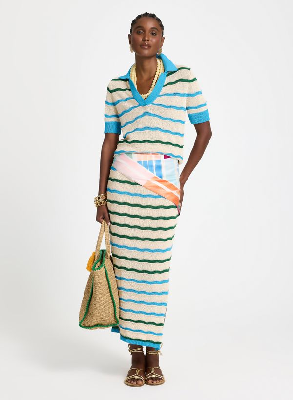 Confeccionada em tricot, a Saia possui modelagem reta, comprimento midi, cós com elástico em azul contrastante, padronagem de listras, fenda lateral posterior que garante movimento e acabamento de barra pespontado.