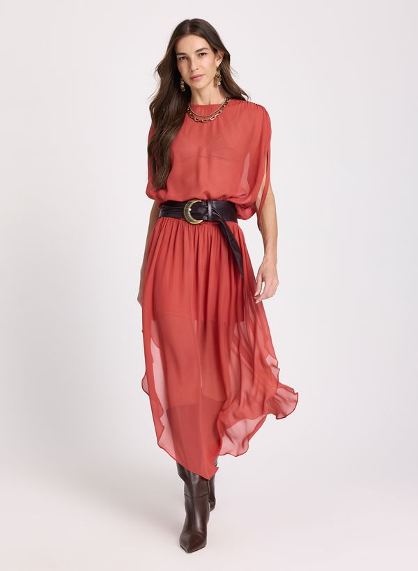 Confeccionado em tecido fluido, a Saia possui modelagem midi com caimento leve, cintura média com pala lisa na parte superior, recorte com franzido logo abaixo da pala criando movimento, transparência sutil ao longo do comprimento, barra assimétrica com acabamento delicado e cós com elástico embutido como fechamento.