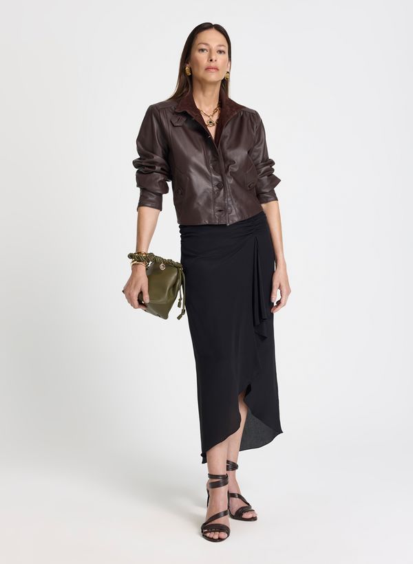 Confeccionada em seda, a Saia possui modelagem midi com caimento fluido, cós alto com detalhe franzido concentrado em uma das laterais, sobreposição assimétrica frontal que cria movimento ao caminhar, acabamento delicado na barra e fechamento posterior por zíper invisível.