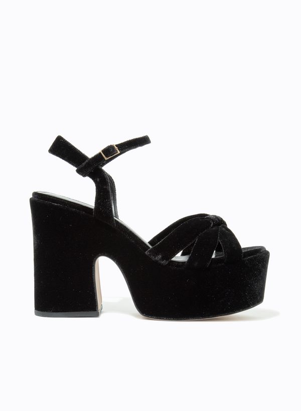 Produzido em material sintético, a Sandália possui meia pata frontal com volume elevado, tiras largas cruzadas sobre a parte frontal, palmilha lisa com assinatura da marca, estrutura robusta com salto bloco alto com 12 cm de altura, fechamento por tira no tornozelo com fivela metálica ajustável e acabamento aveludado.
